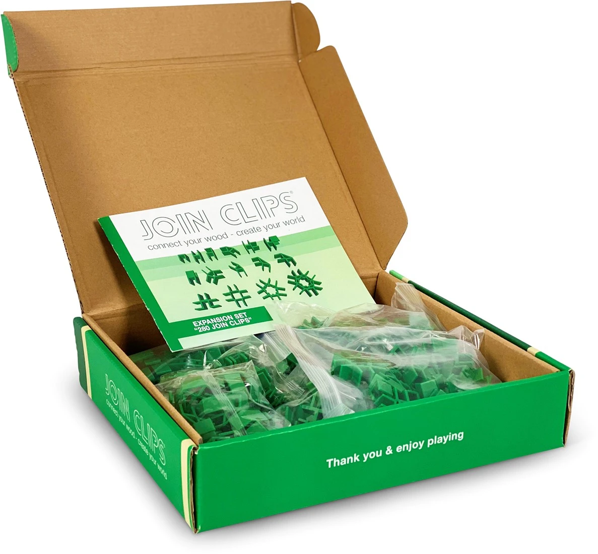 Meer CLIPS van JOIN CLIPS nodig? Deze uitbreidingsset 280 JOIN CLIPS bevat 280 clips om bouw planken te verbinden en je eigen creaties te bouwen. De 15 slim gevormde JOIN CLIPS maken het mogelijk om houten planken of grote bouwplaten onder bijna elke hoek te verbinden. Bouw poppenhuis meubels, auto’s, boten, vliegtuigen en nog veel meer! – het is nu mogelijk met JOIN CLIPS uitbreidingsset 280 JOIN CLIPS. De JOIN CLIPS zijn te combineren met andere merken bouwplankjes met een dikte van 7,9 mm. zoals Kapla.