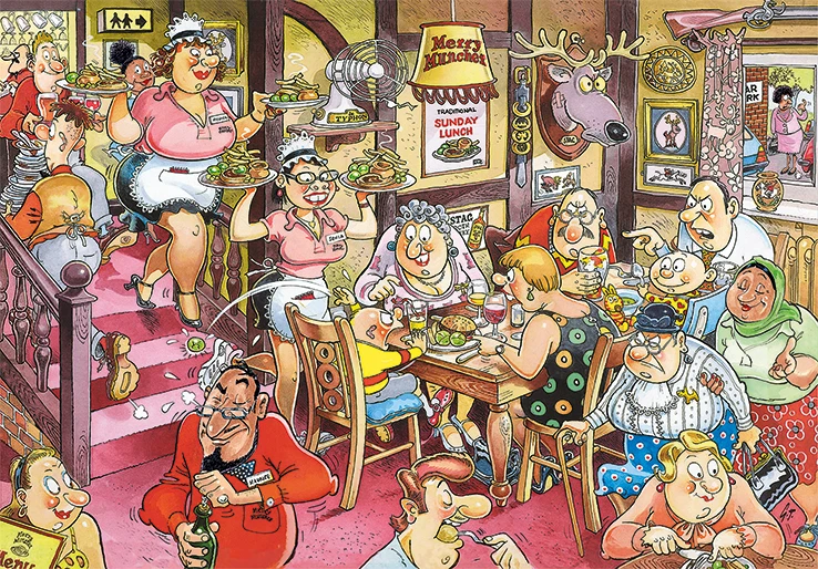 Kleine Tim wordt verzocht zijn spruitjes op te eten tijdens deze familielunch. Zou het echt ernstige gevolgen hebben als hij dat niet deed? Probeer je in te beelden wat er staat te gebeuren.