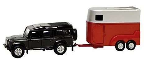 Jeep + paardentrailer met pull-back functie. Schaal 1 : 31. De Landrover en de paardentrailer zijn leverbaar in verschillende kleuren en worden assorti geleverd. De auto wordt zowel in zwart, grijs als wit geleverd. De achterklep en zijdeurtje van de trailer kunnen geopend worden. De paardentrailer is inclusief twee paarden. Afmeting showdoos van de speelgoed auto met trailer ca.: 30,5 x 17 x 7 cm.