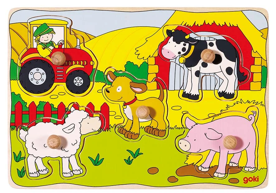 Kleurige houten noppenpuzzel met 5 puzzelstukken.