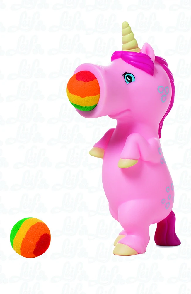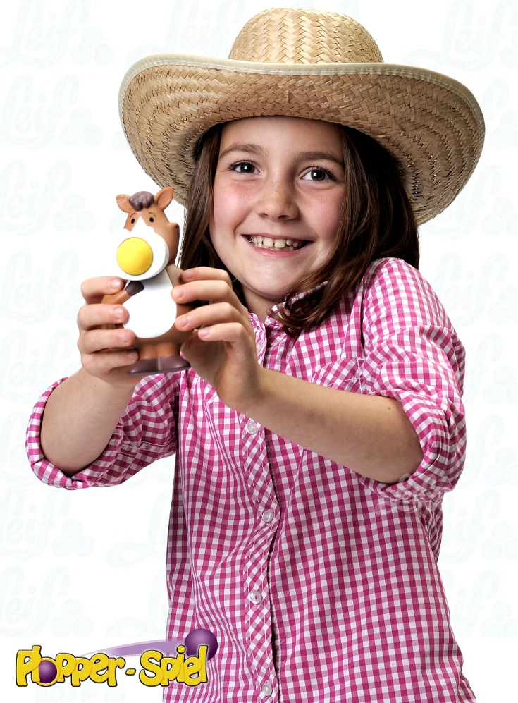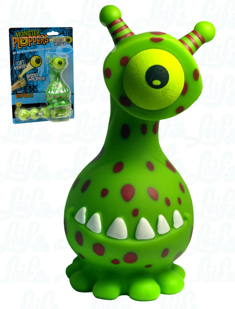 Grappig en heel leuk nieuw spel. Stop het balletje in de bek van het speelfiguurtje, druk op de buik en de bal schiet weg met het kenmerkende “plopgeluid” en kan een afstand van wel 6 m. overbruggen. Hoe verder de plopper wordt ingedrukt hoe verder het balletje vliegt.
