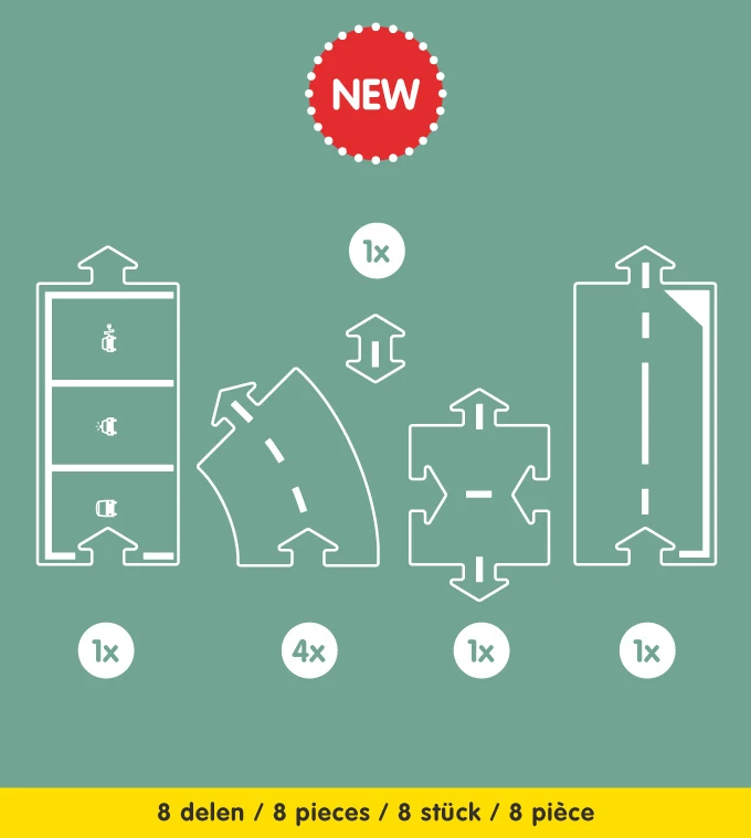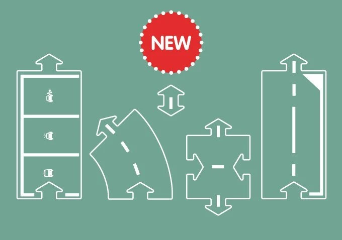 Deze fantastische uitbreidingsset bevat acht baandelen: vier bochten, twee rechte baandelen bedrukt met parkeerplaatsen en het nieuwe speciale verbindingsdeel en koppelstuk. Met het waytoplay verbindingsstuk los je alle verbindingsproblemen op, dit was de ‘missing link’: hiermee leg je eenvoudig een mooie lus in jouw waytoplay autobaan.